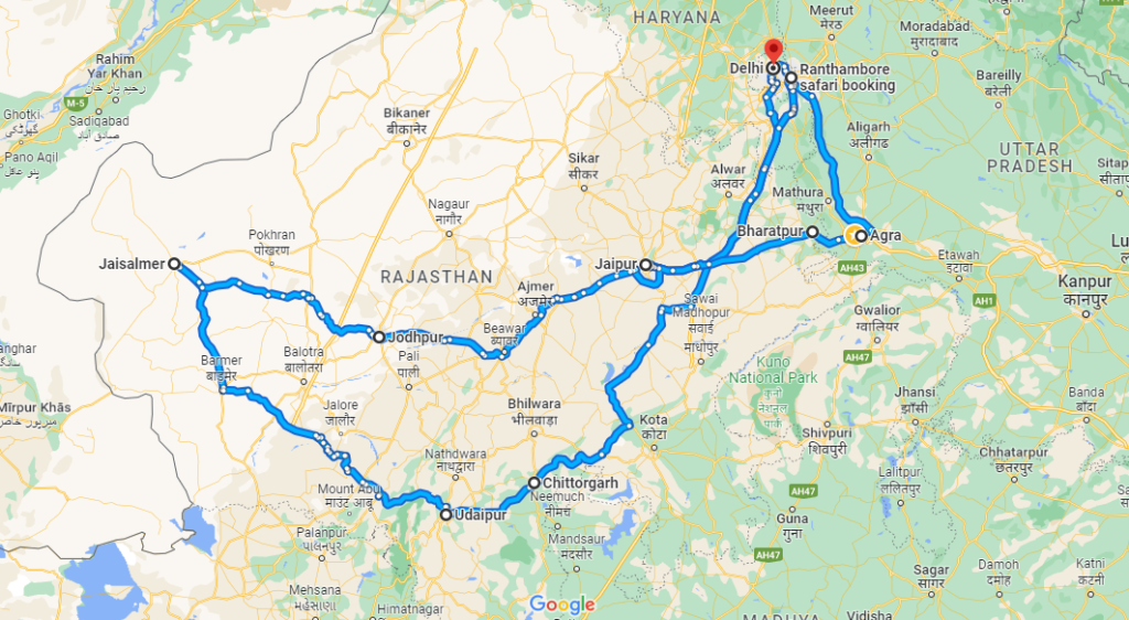 Delhi –>Jaipur –>Ranthambore and Chittorgarh –>Udaipur –>Jaisalmer –>Jodhpur –>Bharatpur and Agra –>Delhi